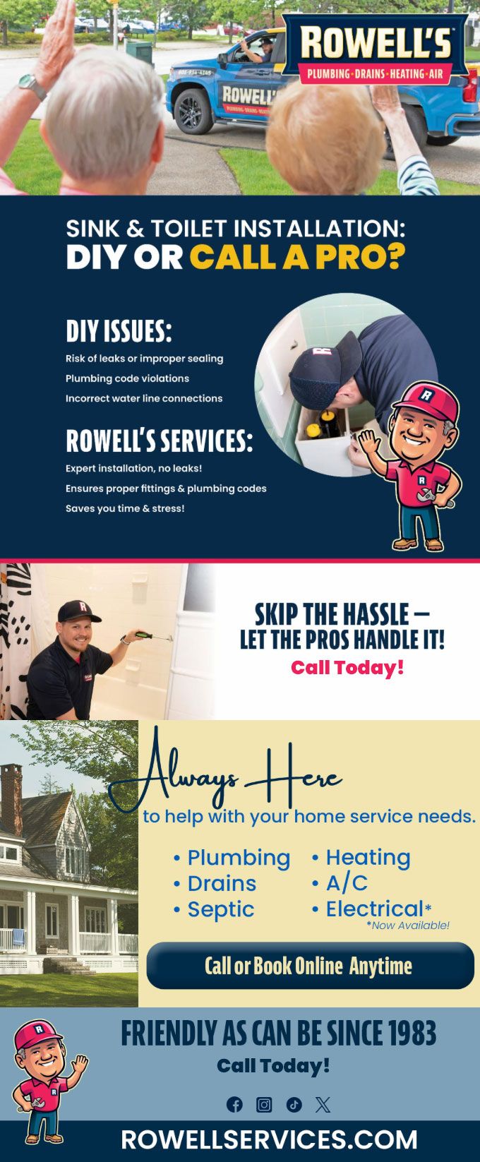 "Friendly As Can Be Since 1983!" When you need help with your plumbing, drains, heating, cooling or electrical in Chichester, you can always rely on Rowell's Services! Call us now or book online!